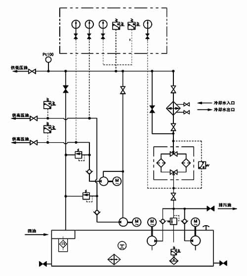 本产品组成部分也和普通高(低)压稀油站相同;仅比它多一台高压油泵,二台高压油泵的吸口均联于低压泵的供油口;二台高压泵均启动时,要从低压供油口吸走5L/min的润滑油,对低压泵流量较小者,启动高压泵时低压供油压力可能会有所降低,对润滑油均供向同一轴承的系统来说,轴承的润滑油总量并未减少,不会影响对轴承的润滑;但启动高压泵时,低压压力的降低可能造成备用低压泵会临时启动,这种情况也不致影响润滑系统的正常工作;但采用二低压泵互相切换的备用工作方式时,可能工作泵停止后,备用泵流量仍不满足要求时就不能使润滑系统正常工作了;故选用较小流量低压泵时应注意这一情况。