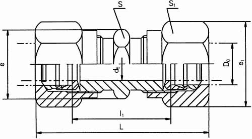 公称压力J级,管子外径D0为14mm的卡套对接直通管接头: