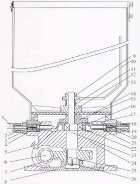 | 本机为真空吸压式柱塞泵,其运行通过电机联动泵体内的蜗杆、蜗轮,中心轴上的推动套,经它的平行径向运动,推动大柱塞实现供油,中心轴在运动的同时连体带动压油板,刮油器同步转动,将油不断压入过滤网面被吸入大柱体内。刮油器每转一周,各油咀均供油一次。 |